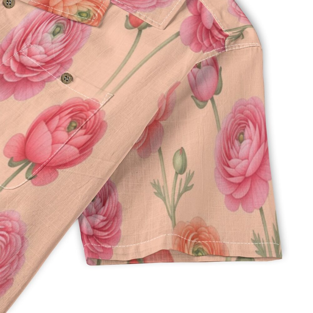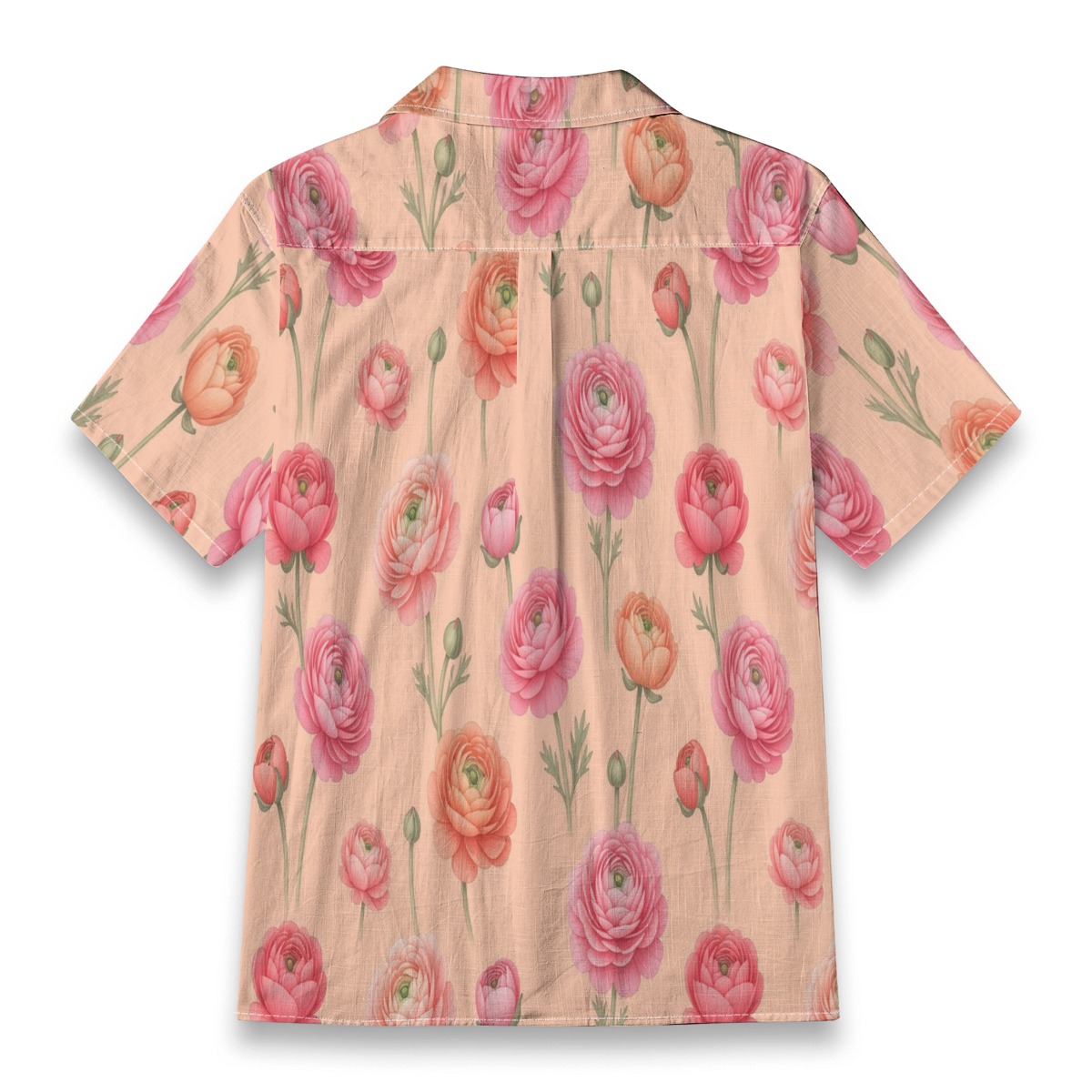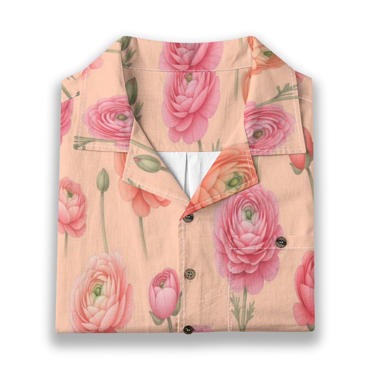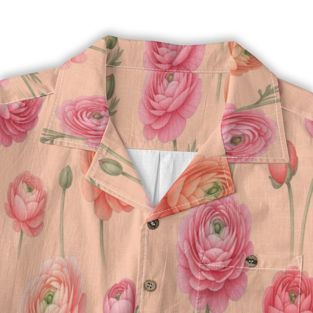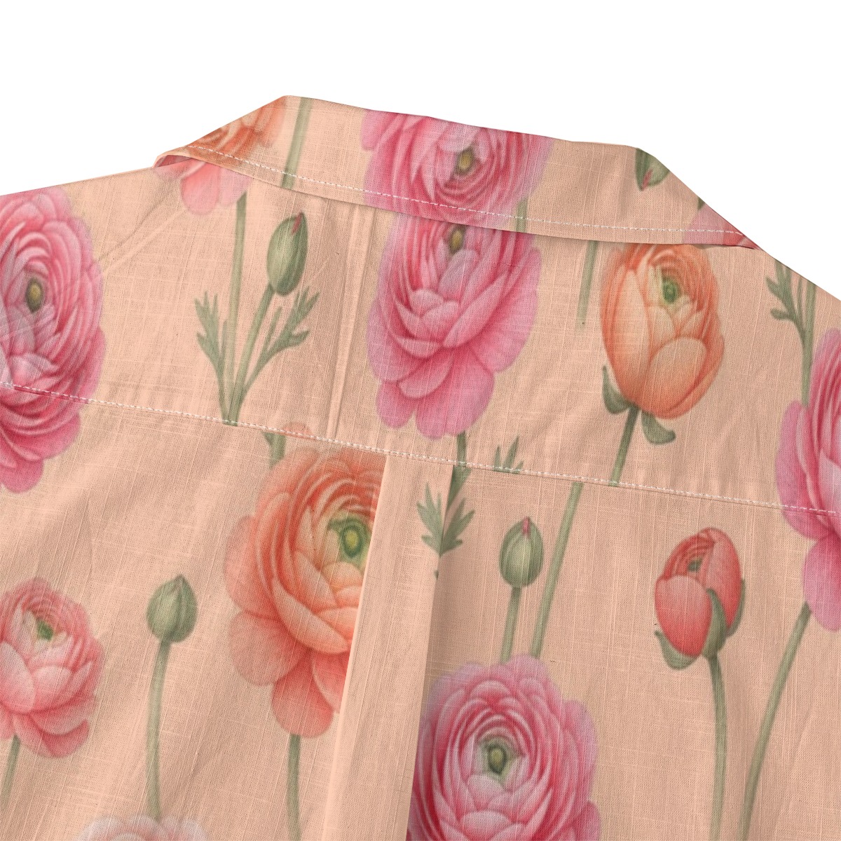 Layered ranunculus petals create a soft and romantic pattern filled with gentle movement. Peach and coral tones blend beautifully, giving a warm and inviting tropical feel.
